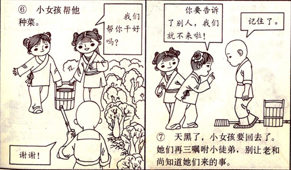 天黑了,小女孩要回去了。她们再三嘱咐小徒弟,别让老和尚知道她们来的事。她们对小徒弟说“你要告诉了别人,我们就不来啦。”