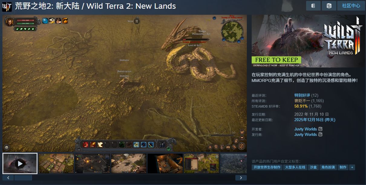 该作品是由俄罗斯团队 Juvty Worlds 打造,原名为《Wild Terra 2: New Lands》,目前在 Steam 全部评测中,共有 1165 篇用户评测,好评率 59%,整体评价为「褒贬不一」。