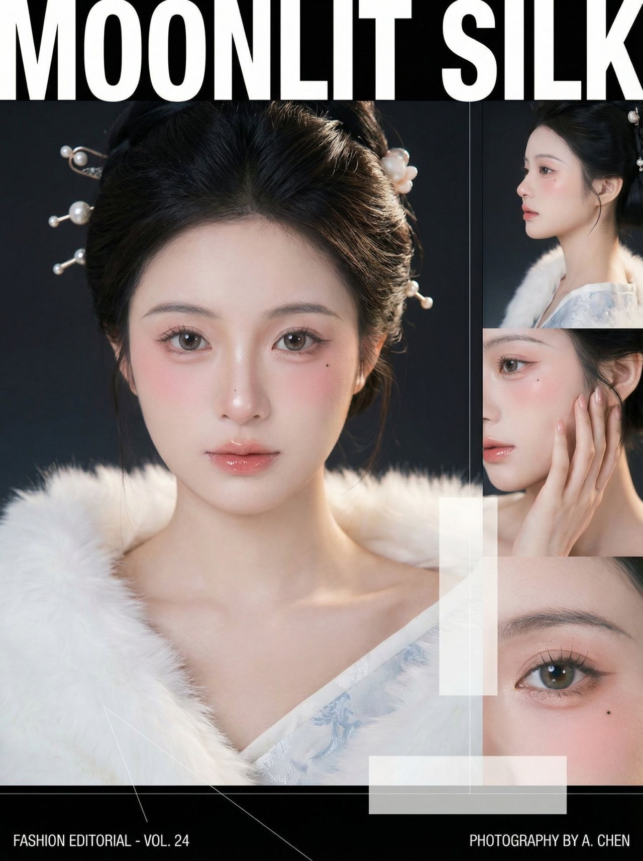 2 拼贴结构:右侧或一角增加多张小图拼贴,可包含侧脸特写、手部特写、局部妆容特写等,形成杂志排版感。