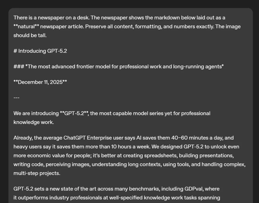 但这次 OpenAI 展示了一个极其硬核的案例:让 AI 生成一张竖构图的报纸,并且要把一段复杂的 Markdown 格式文本,以自然的报纸排版填进去。结果怎么样?它不仅把文字一个不错地写了上去,甚至还处理好了标题的字号、正文的缩进,以及报纸特有的那种陈旧纸张质感。