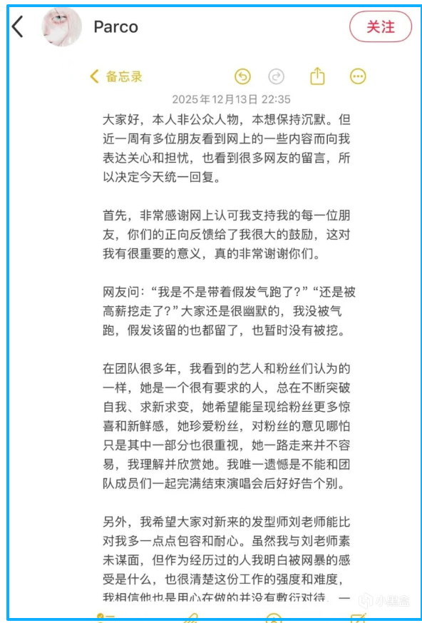 12 月 13 日,前发型师张振主动发声,否认自己因网暴或高薪挖角离职,只可惜没能和团队好好告别。他还替新发型师说话,称自己懂被网暴的滋味,相信对方是用心工作的,呼吁大家因喜爱艺人而多给团队一些温度。
