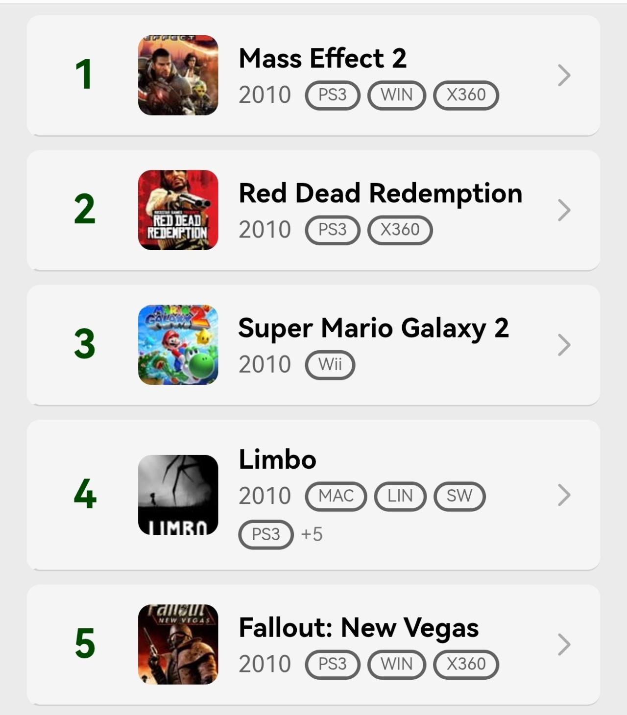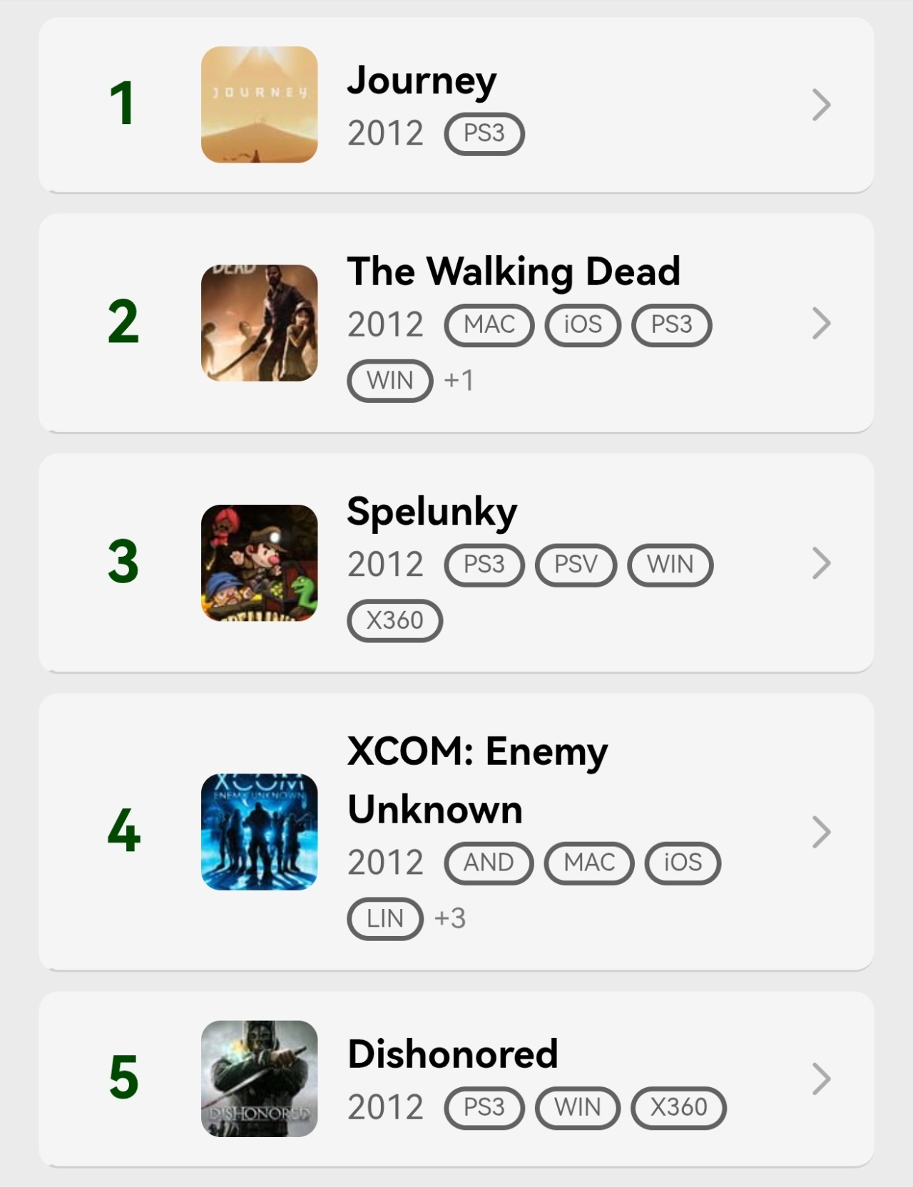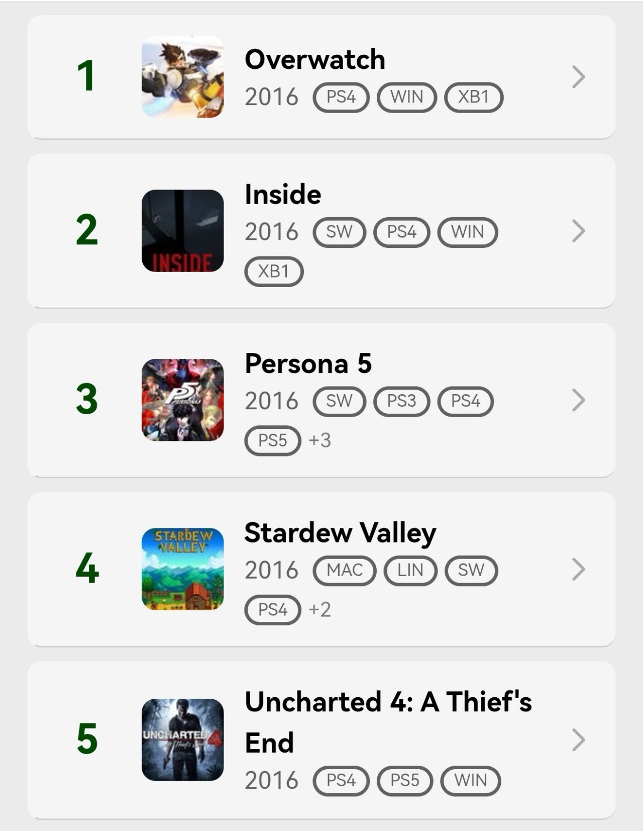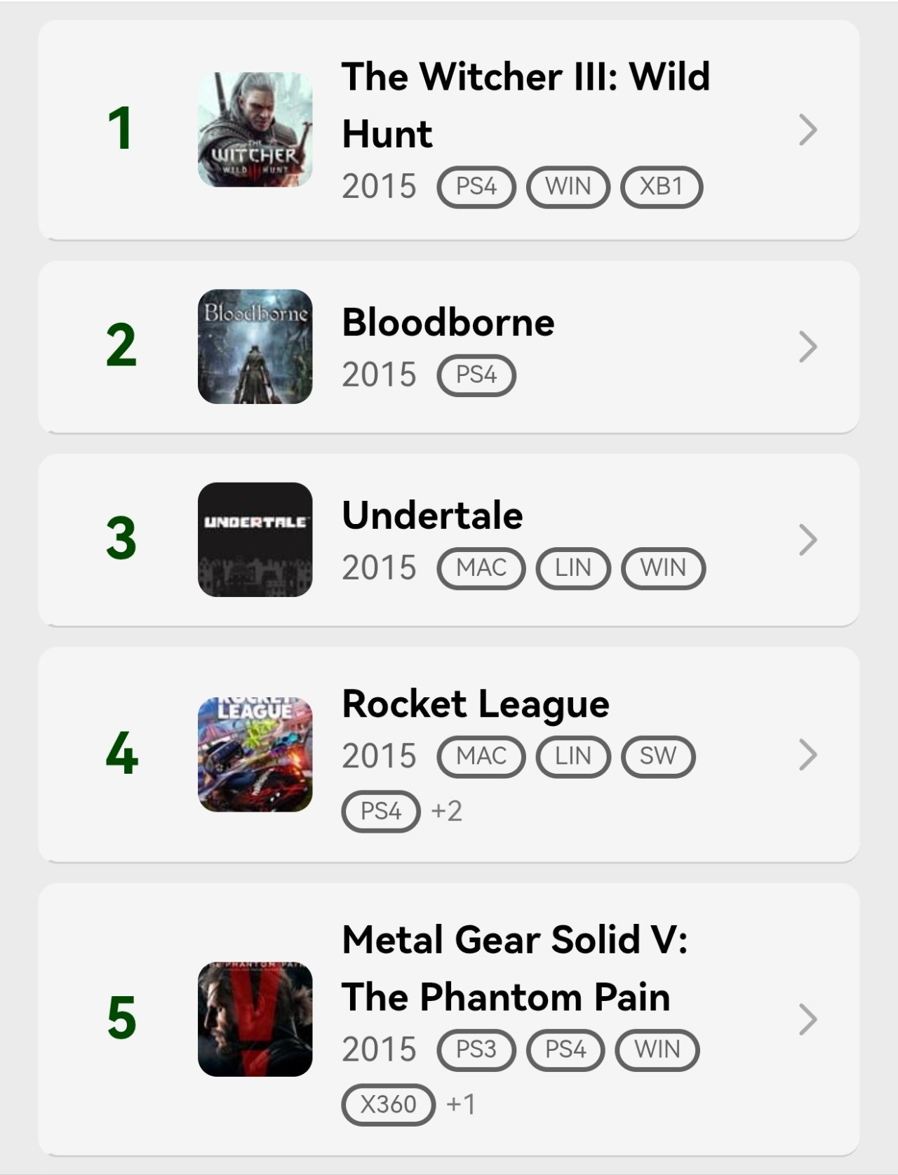 再来看看其他年份,那些年的奖项赢家都经受住了时间的考验,不过也能很惊喜的看到很多被当年奖项冷落的游戏名列前茅,比如星露谷物语,传说之下,我的世界这些影响力巨大的独游,也有黑暗之魂,马里奥银河2,辐射新维加斯这些在玩家群体中口碑极好的神作。而部分提名游戏则随着时间流逝,变成了只在当年有所闪耀的游戏
