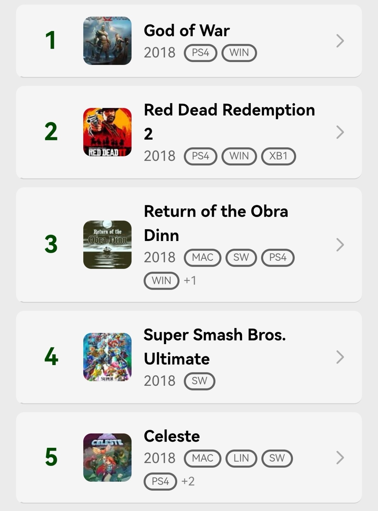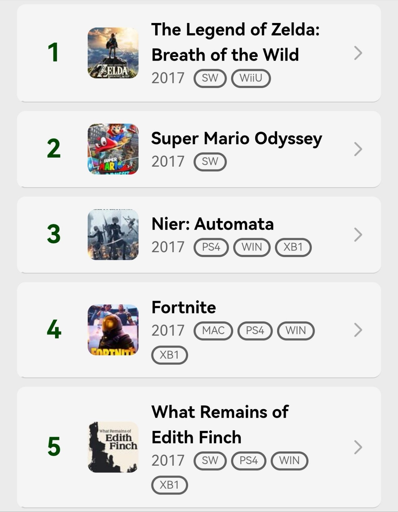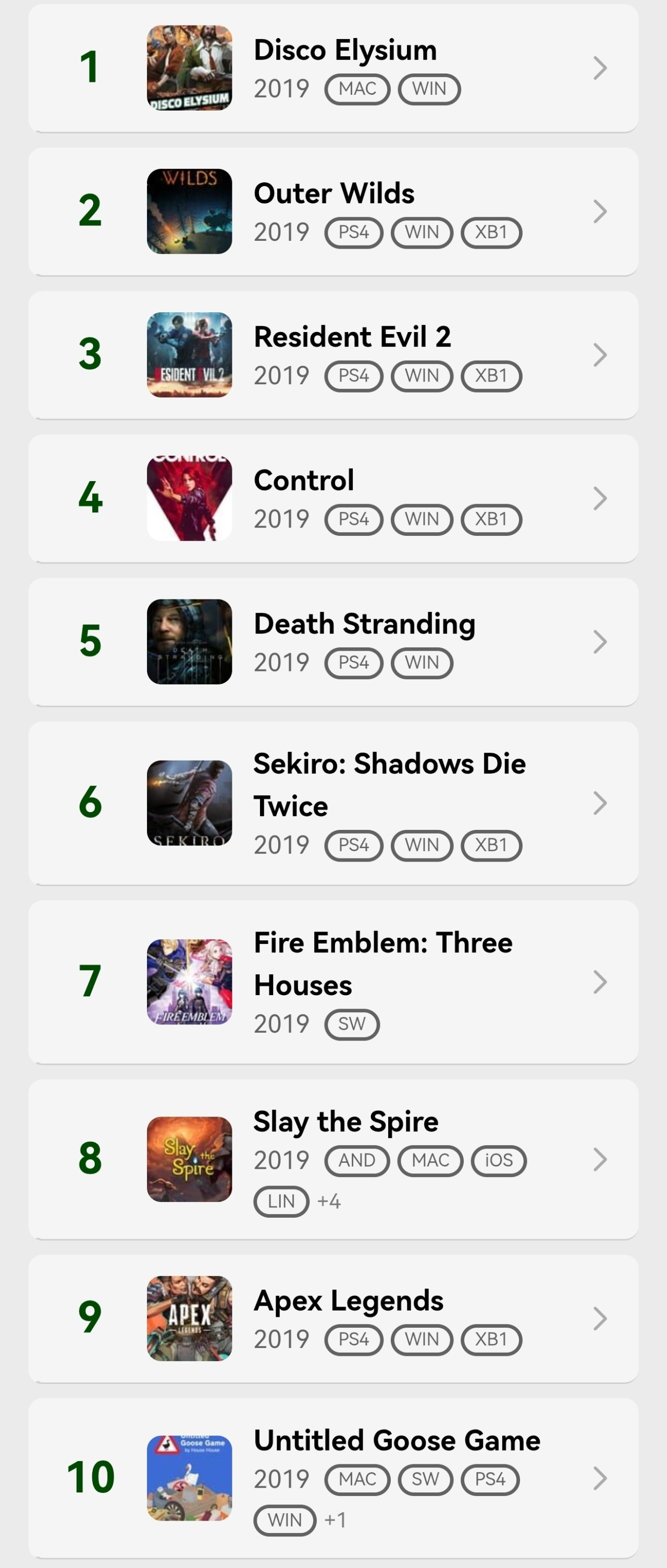 反观获得当年TGA年度游戏的只狼仅仅排在了第六位,低于同样被提名的生化2,控制和死亡搁浅,而获得DICE和GDC双料年度的大鹅也只排在第十。