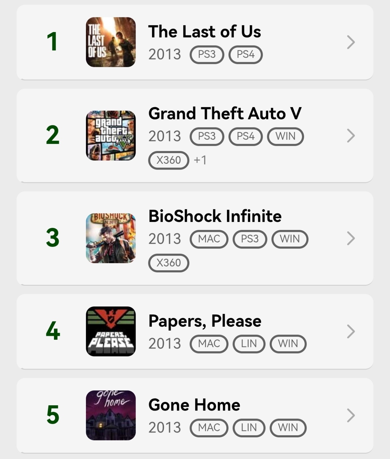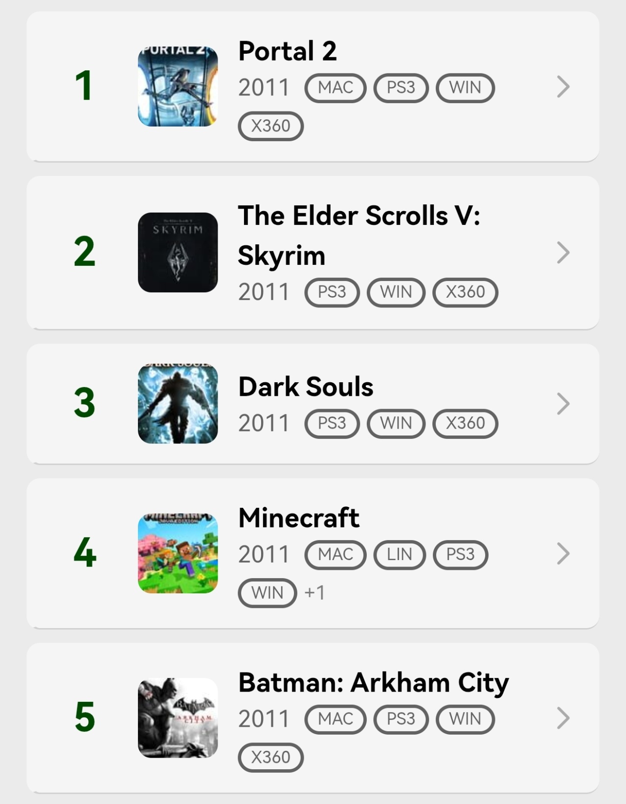 目前游戏界没有采用这种“滞后评价”的奖项,我还是以之前在https://api.xiaoheihe.cn/v3/bbs/app/api/web/share?h_camp=link&h_src=YXBwX3NoYXJl&link_id=f91670b6b13e这个帖子中提到的网站Acclaimed Video Games为例,它并不是单靠某一次奖项或某一家媒体下结论,而是把大量来自不同媒体与不同时间点的“年度榜、年代榜、历史总榜”等评论榜单汇总,形成一个跨时间维度的综合排名体系,并且与时俱进,因此我认为它的榜单能一定程度上代表滞后评价。