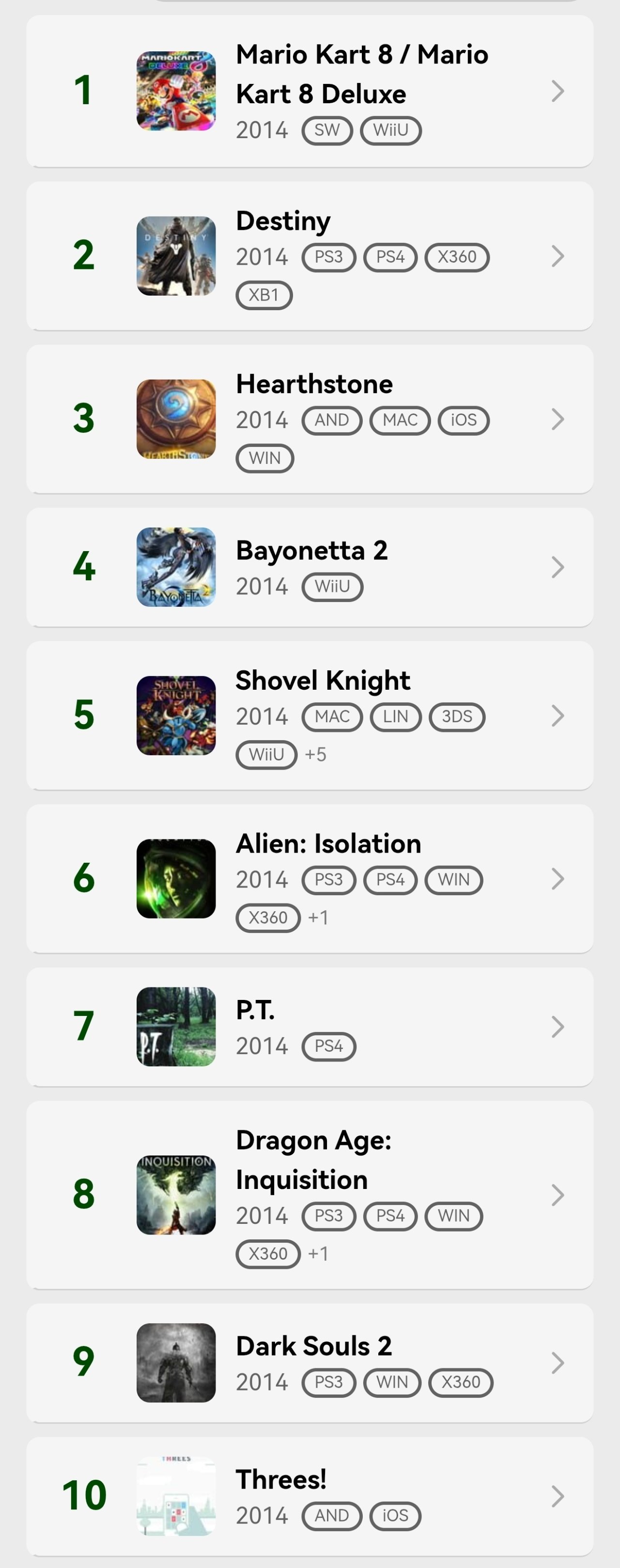 值得一提的是,2014年和2019年都是公认的“小年”,所以选出来的年度游戏有点“矮子里拔高个”的意味,随着时间流逝被其他游戏超过也就不足为奇了。