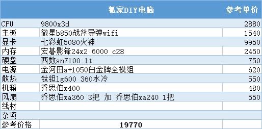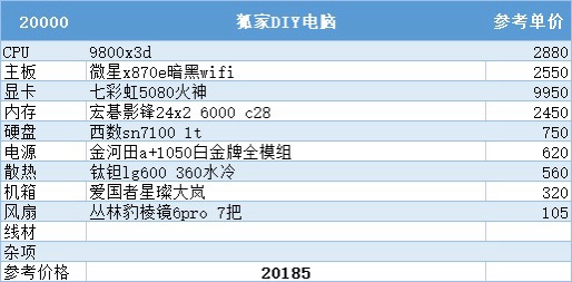 9800x3d加5080,正常游戏玩家能用到的最强配置了,不管是网游还是3a均可通杀,到了这之后再高的预算对性能的提升也不大了,想要质变只能上5090