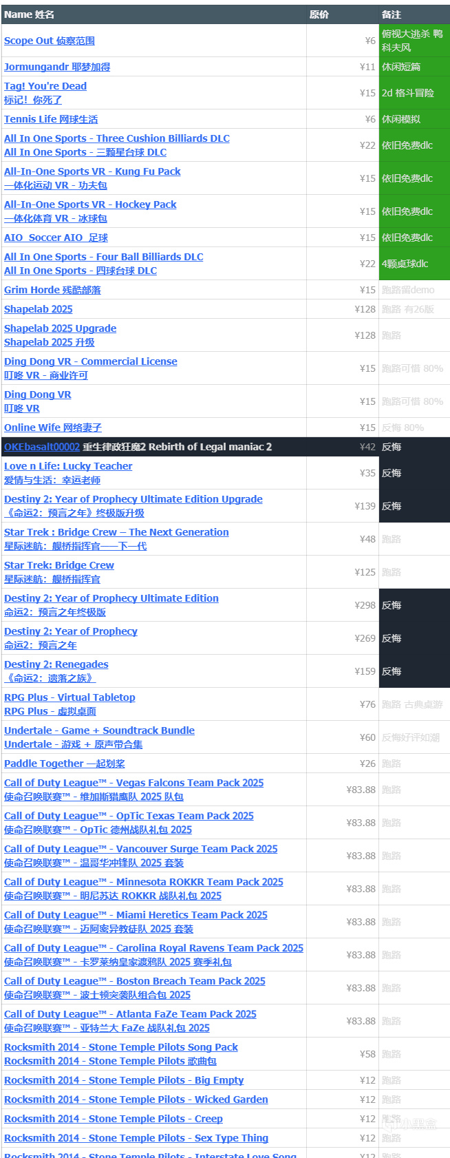 然后是手速临时工系列了,截止发稿时间还可抢5款本体+5款dlc。cod畅玩同时也到期下架一些包,rocksmith稳定发挥继续下架老款,表格太长已经放不下,后面都是rocksmith。