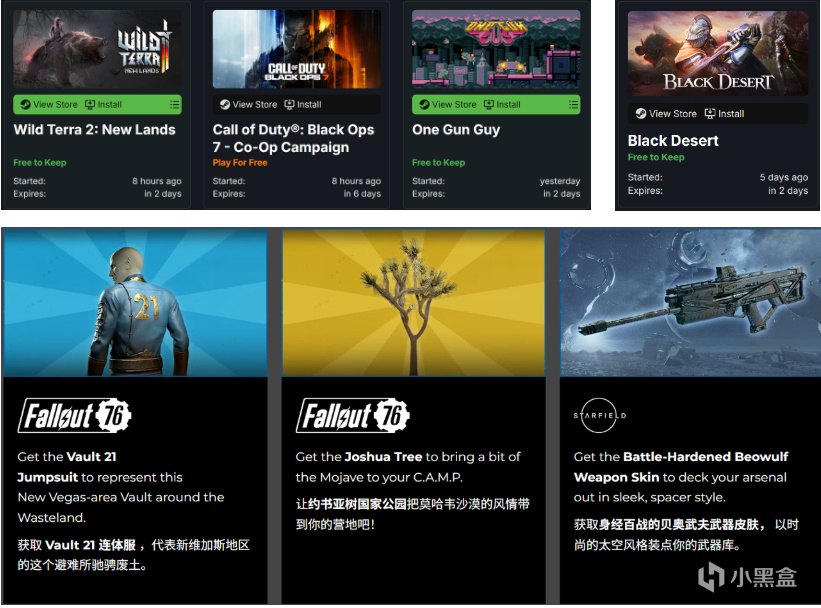 辐射系列赠送礼包,fallout76送连体衣和公园装饰,fallout1限免畅玩,直接去官网领取。首先是平台大礼包,Steam已经可领2款(荒野2和一枪仔),畅玩另外2款是黑沙和cod7。https://api.xiaoheihe.cn/v3/bbs/app/api/web/share?h_camp=link&h_src=YXBwX3NoYXJl&link_id=fd4c71404990