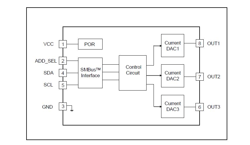 OUT为电流输出一共有OUT1,OUT2,OUT3共3路,也就是模拟信号。