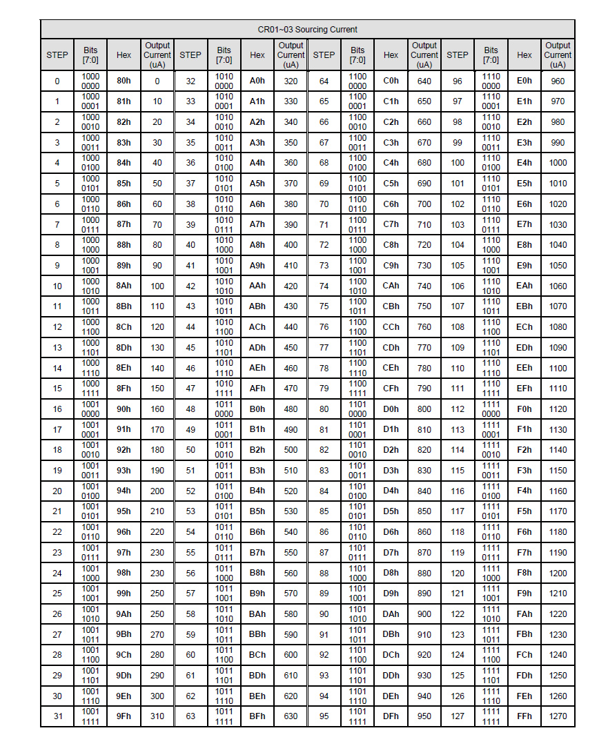 输入二进制10000001(16进制81)表示增加10μA电流