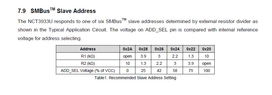因为一条总线上面连接了很多设备,所需需要地址来确认选中的设备。该芯片通过两颗电阻设定芯片地址,R1 1.3K,R2 3.9K则设定地址为0x22。
