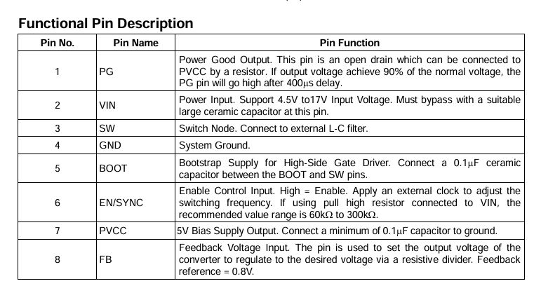 根据上图芯片手册可知FB引脚电压为0.8V。图1两个电阻阻值和前文串联分压公式可以计算出Vout=0.8*(2+1.6)/1.6=1.8V,设计者希望它输出的电压是1.8V。