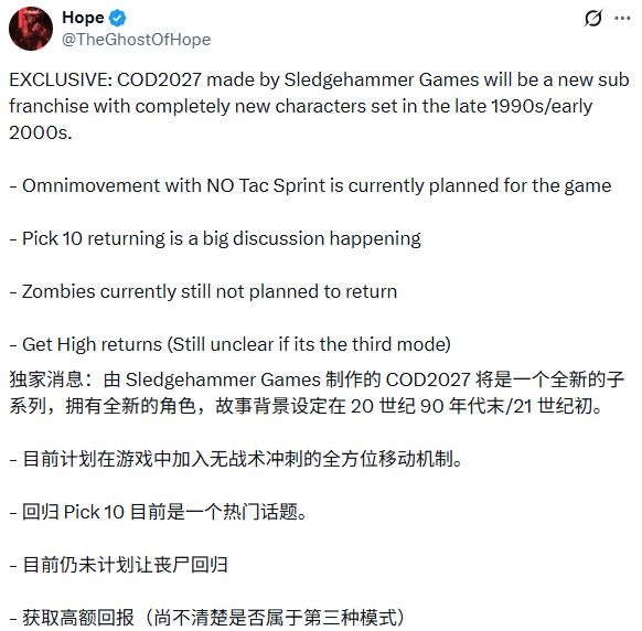 TheGhostOfHope还透露了2027年《使命召唤》的玩法与模式细节。据其表示,游戏计划采用全向移动系统且不包含战术冲刺功能。同时,Sledgehammer Games内部正在就是否回归“Pick Ten”系统(允许玩家选择十种元素配置装备)进行激烈讨论。此外,僵尸模式目前未计划加入这款新的《使命召唤》游戏。