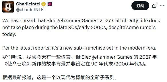 根据多方传言,由Sledgehammer Games开发的2027年《使命召唤》作品背景将设定在1990年代末至现代之间的某个时期。知名《使命召唤》消息人士TheGhostOfHope与charlieINTEL对《使命召唤2027》游戏背景设定提出了相互矛盾的传闻。前者称游戏时间点设定在1990年代末至21世纪初,后者则声称背景为现代。但两位消息人士均认同这款未公布的作品将基于全新子系列开发,并采用全新角色阵容。