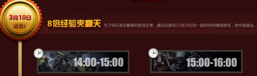 ·3月19日至3月24日,玩家每日登錄遊戲皆可於次日領取對應道具獎勵,包括黎明玫瑰(7天)、Barrett-牡丹(7天)、M4A1-牡丹(7天)等。活動期間,玩家累計登錄遊戲滿3天,即可在爆破達人包、救世達人包和挑戰達人包三款實用戰鬥包中擇一領取。