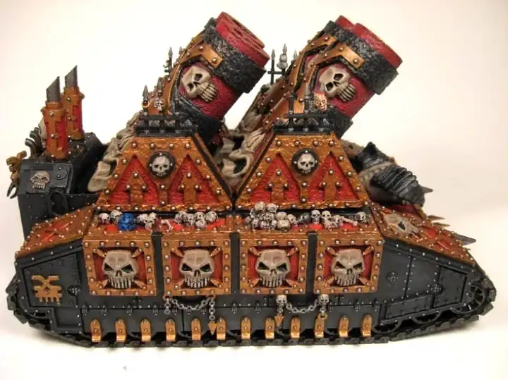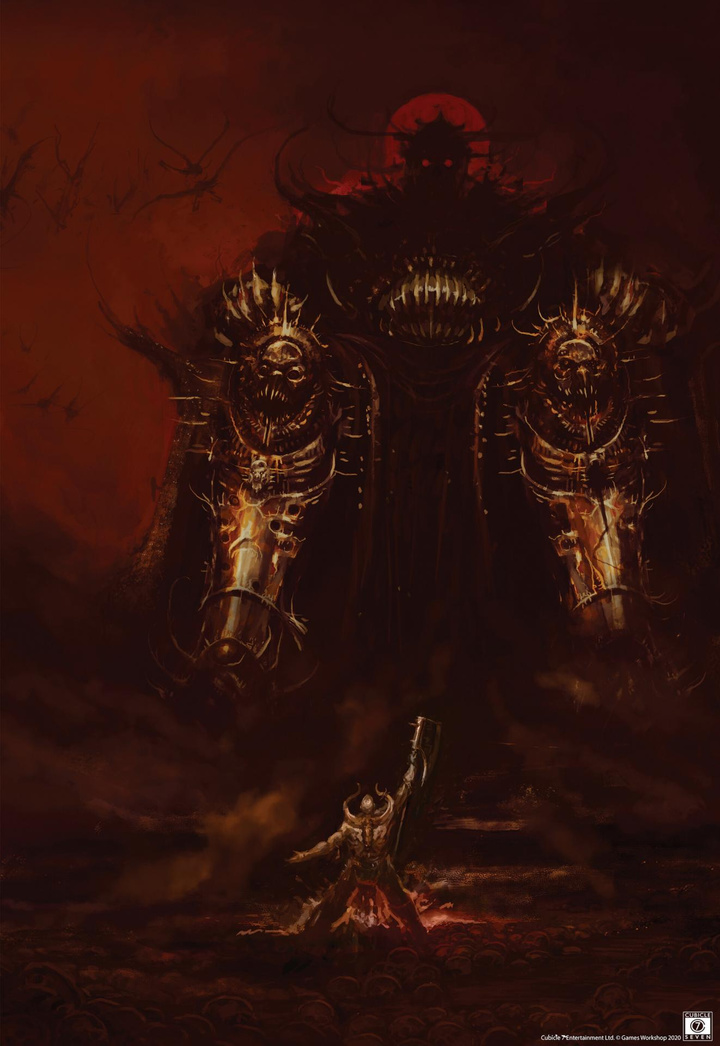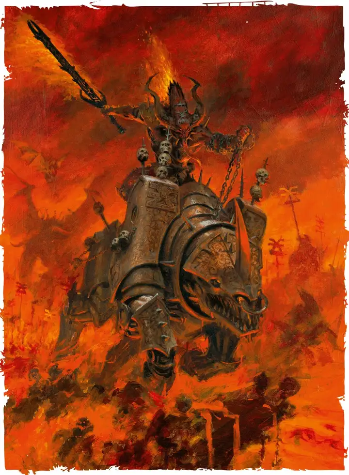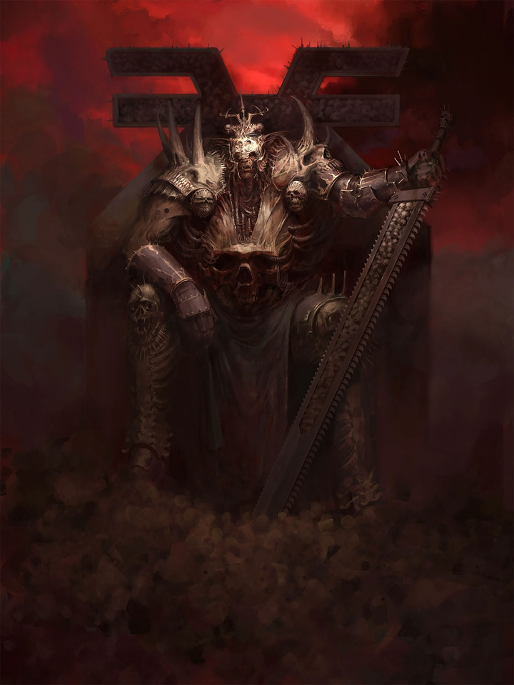 恐虐强壮到夸张的躯干被层层叠叠的黄铜与黑铁铠甲进一步扭曲变形,其每句言语皆会化作无穷怒火的咆哮,嗜血的嘶吼在其国度中反复回荡。它蛰伏于雕琢精密的黄铜王座,身下颅骨之山蜿蜒耸立。这些可怖的战利品既包含有血神冠军勇士的首级,亦包含着着他们手下败将的残颅。