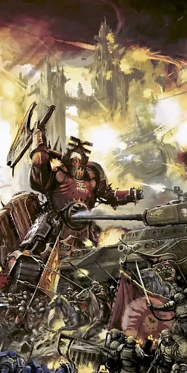 "我曾目睹那永恒的征战。凡人搏杀恶魔,闪电撕裂火山,熔铜喷泉与蒸腾血湖彼此吞噬。没有喘息,没有和平。胜者甫一诞生,旋即被更可怖的敌手围攻。鲜血飞溅喷涌,颅骨堆砌成刺破赤空的王座。那是怒与狂的具现化,嘶吼永无止息。那是何等的…壮丽绝伦。"—"嵌甲锋刃"战帮灵视者德萨克·斯莱特