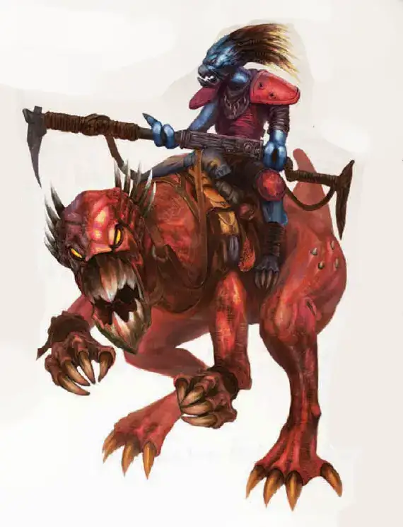 血肉猎犬——血肉猎犬是形态可怖、凶暴异常的类犬型生物,以其追踪选定猎物的超自然能力而恶名昭彰。它们佩戴被称为"恐虐项圈"的附魔颈环,这使它们对巫术或灵能影响具有极高抗性。