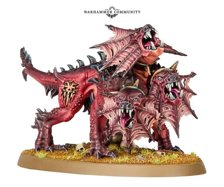 卡兰纳克——卡兰纳克是那只在血神疆域黄铜要塞宏伟王座间巡行的三首血肉猎犬。他永不入眠,如同血神的复仇意志一般,卡兰纳克始终警醒。他会搜寻每道阴影中的入侵者与闯入者,或啃噬颅骨王座丢弃的骸骨,或在拱顶大厅潜行追踪放血鬼取乐。作为恐虐复仇之念的实体显化,卡兰纳克是血神钦定的猎手,是只会在追猎那些违背其战士信条、或亵渎其滔天傲慢之存在被释放的恶魔。