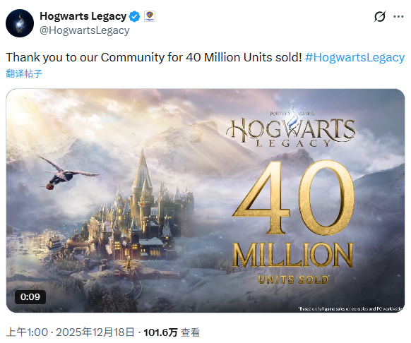 华纳兄弟游戏确认开放世界动作角色扮演游戏《霍格沃茨之遗》全球累计销量已突破4000万份,创下重大商业里程碑。该消息通过游戏官方X账号公布,显示这款发售近三年的作品仍保持强劲势头。销量数据涵盖全平台与地区累计结果。