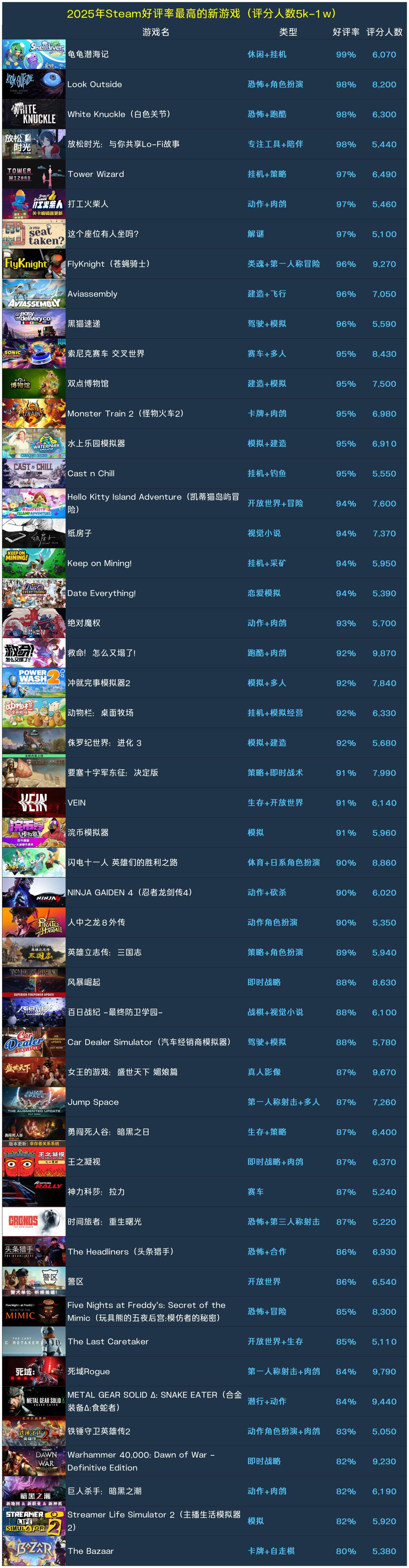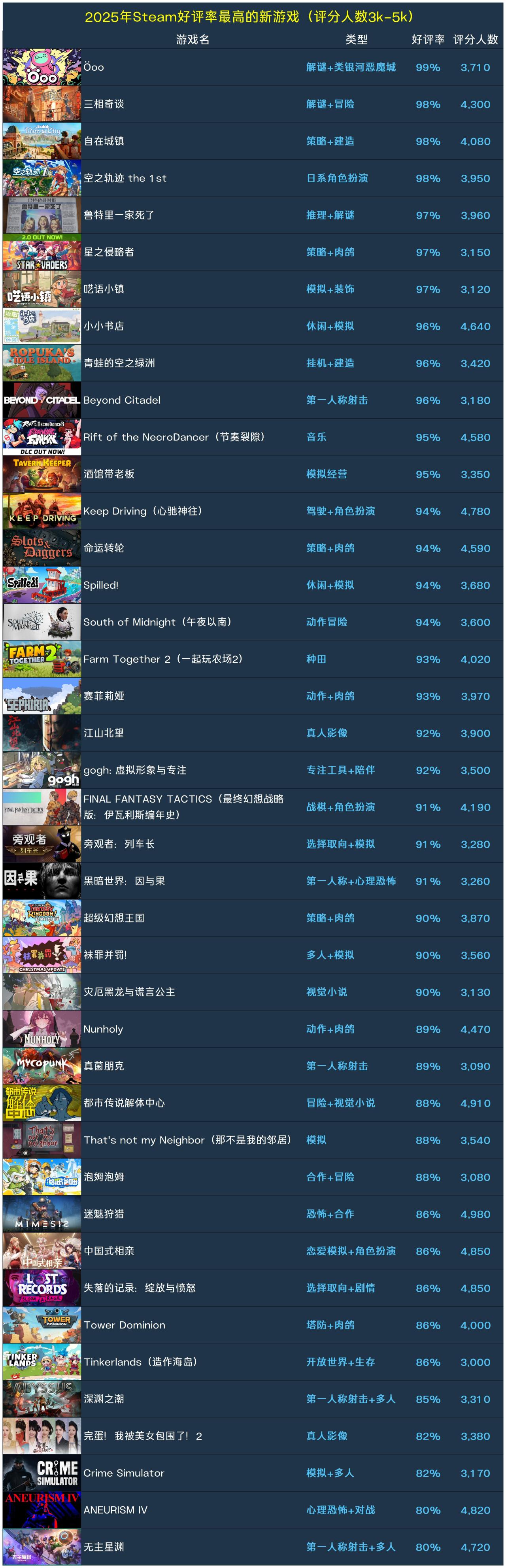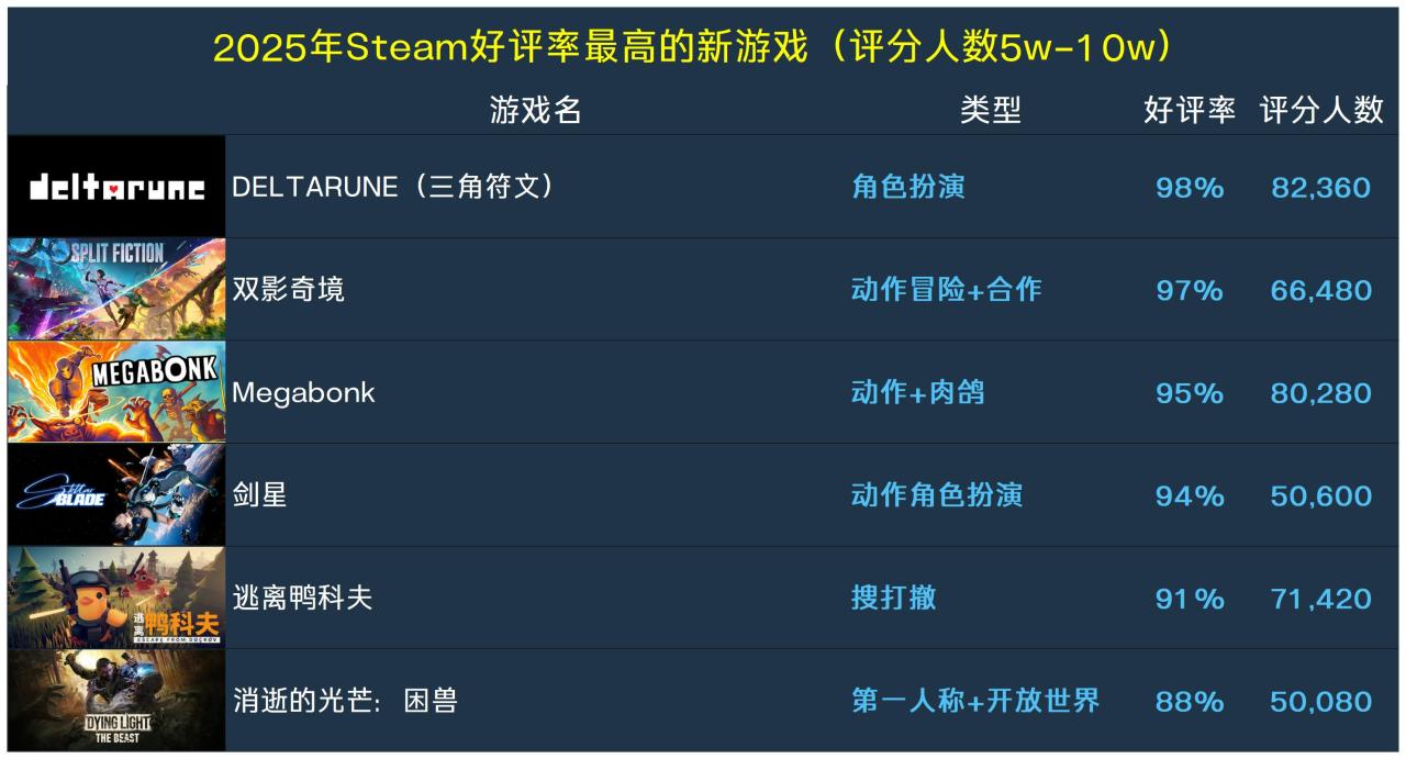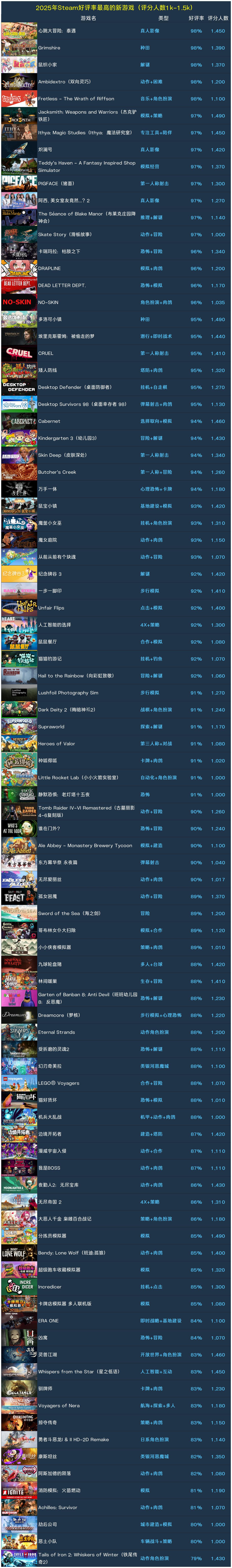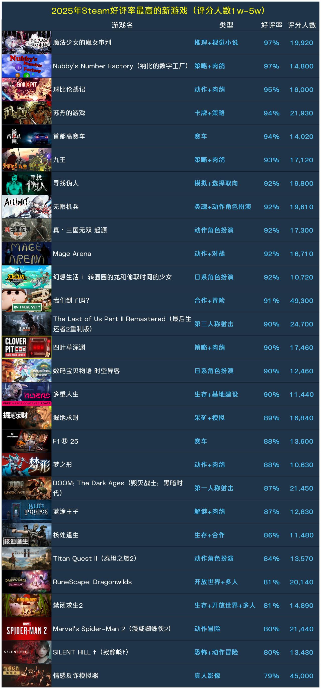 仅选取Steam商店评价数≥1000,且好评率≥79%,2025发售的新游戏