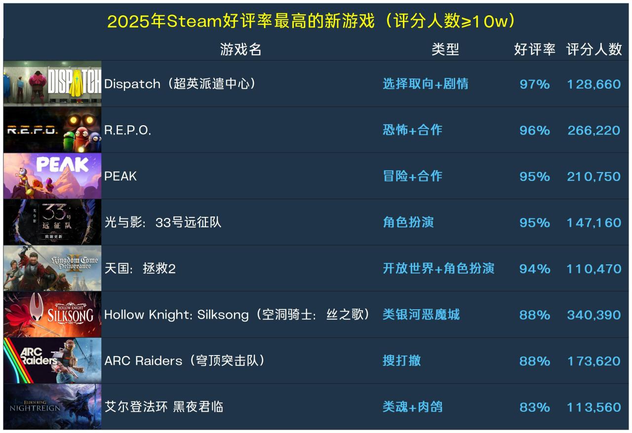 Steam冬促不知道买什么游戏?没关系,这里整理了一份2025年Steam好评率最高的新游戏列表,总数多达335款。为了方便查看,我按照评分人数分成了8个不同的梯度,希望大家都能找到想要的游戏!