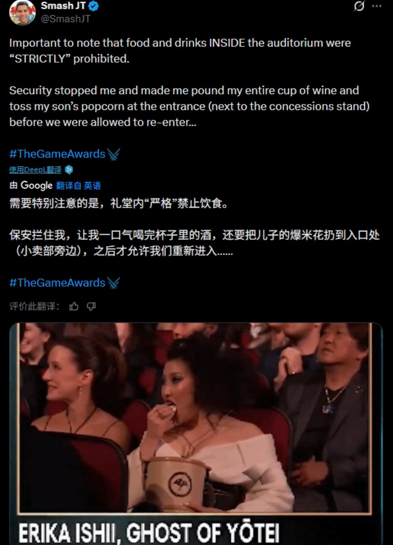 游戏业内人士Smash JT发文称,自己参加TGA时因携带食物被保安拦下,被要求处理掉儿子的爆米花并喝完杯中酒才能入场,保安强调会场内严禁饮食且每个人都需遵守规则。