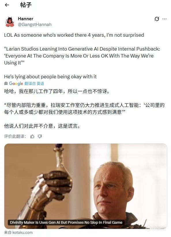 曾在拉瑞安任职、网名为Hanner的前员工就表示:她此前在质量测试和制作岗位工作,管理层在开发者并不情愿的情况下强行推行生成式AI