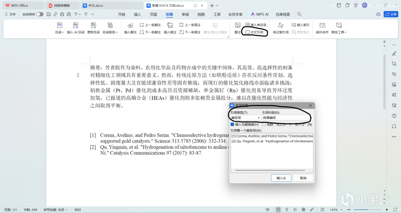 将光标定位到你需要引用的正文处,在引用栏目里面找到交叉引用,在具体小栏目设置里面,和lz选择一样的,记得点上超链接,然后就可以在下面选择你想要在这个地方引用的文献,插入。