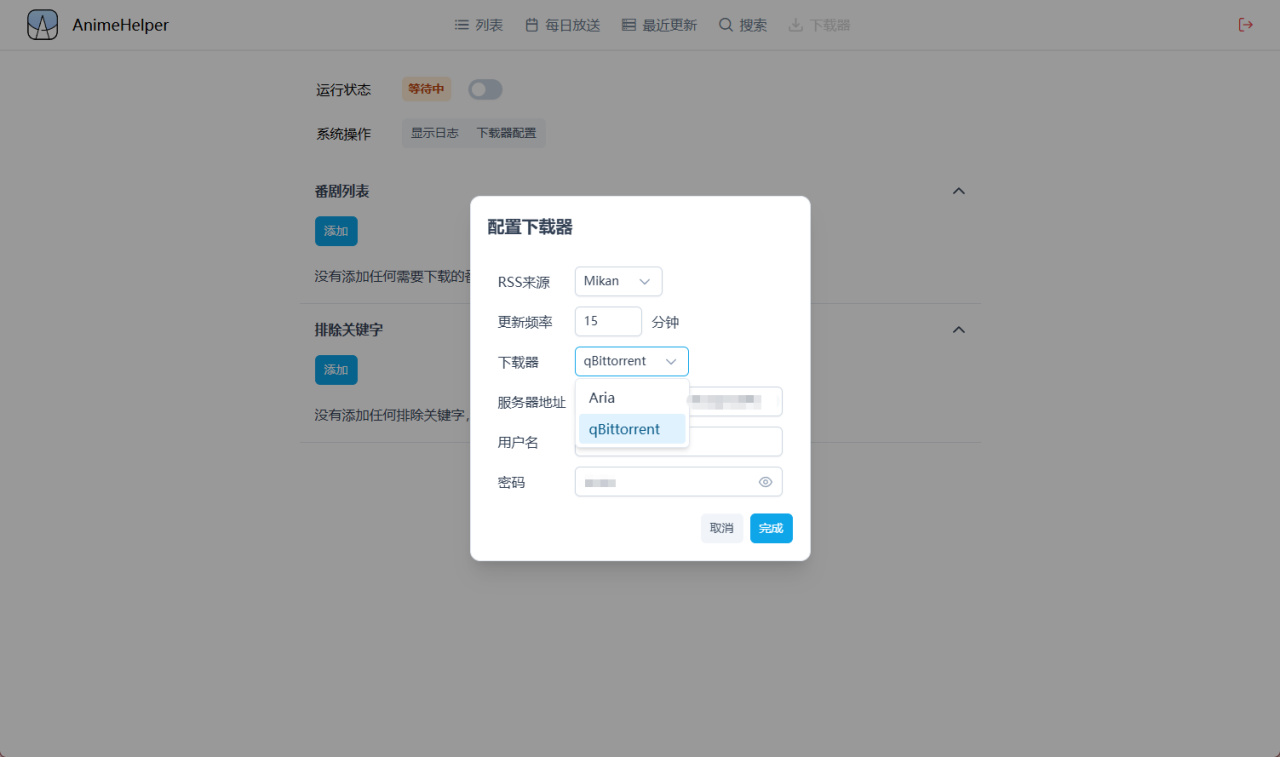 下载器支持多个RSS来源,可以使用qBittorrent 与 Aria进行追番下载,只需要设置好服务器的地址、用户名以及密码即可。