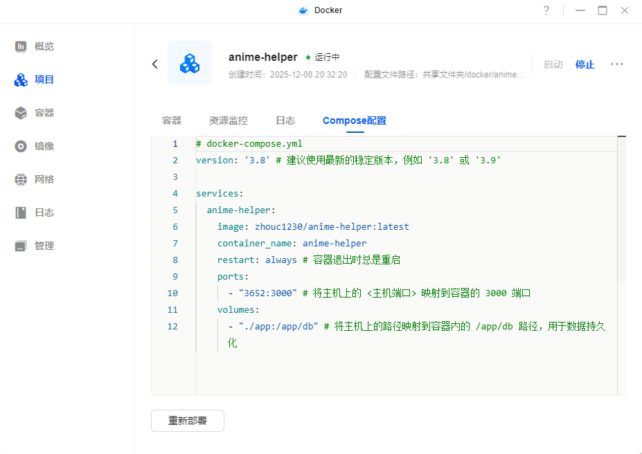 代码中的端口和映射记得根据自身NAS环境进行更改。