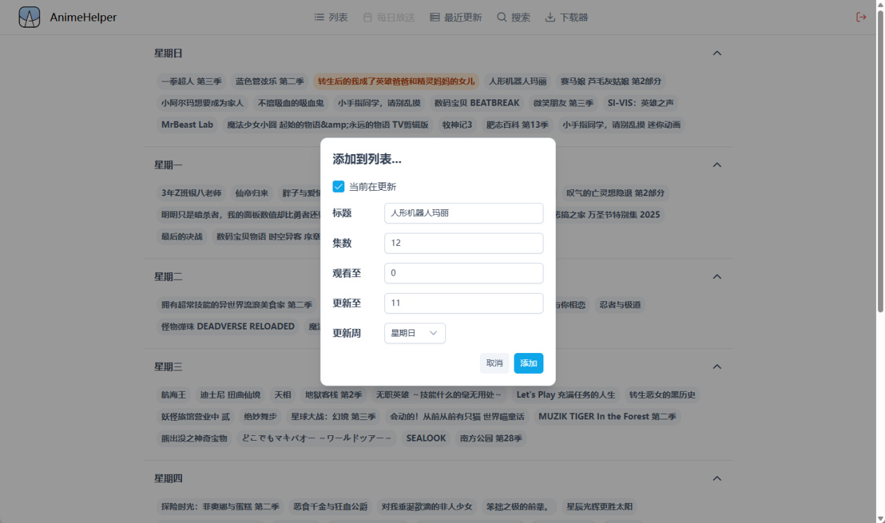 在每日放送这里能看到对应的每天更新的番剧名,点击之后可以直接添加进追番列表中,项目可以自动同步当前更新的集数,你可以手动设置当前观看的集数,之后下载器便会下载后续更新的内容。