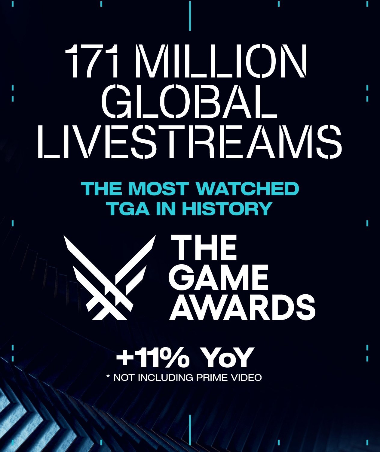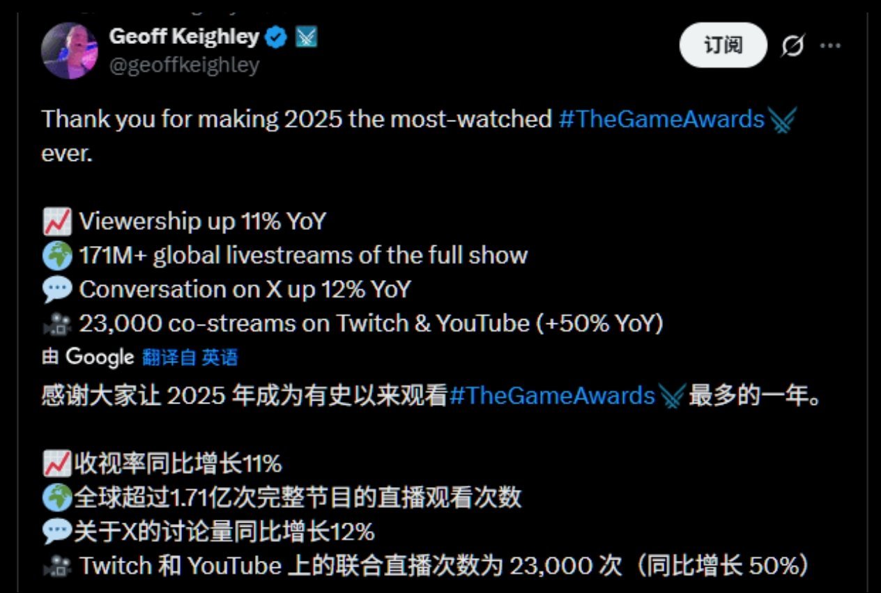 TGA主創兼主持人Geoff Keighley今日官宣,2025年TGA頒獎典禮全球直播觀看量高達1.71億次,相比2024年的1.54億次增長11%,正式成爲“史上觀看人數最多的TGA”。