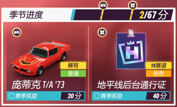冬季赛20分进度奖励为1973款庞蒂克 FIREBIED TRANS AM SD-455和40分进度奖励为地平线后台通行证