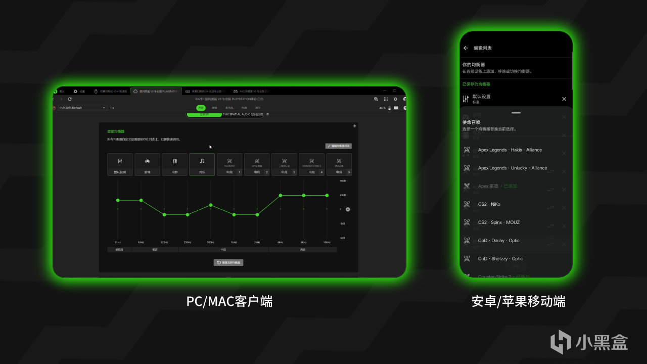 除了支持雷雲4的pc客戶端以外,還支持手機app,調EQ,設置板載音效配置文件,不同的遊戲有專門的音效文件,而且是跟職業電競選手一起調的。支持最多9種板載配置可以直接通過按鈕循環切換。