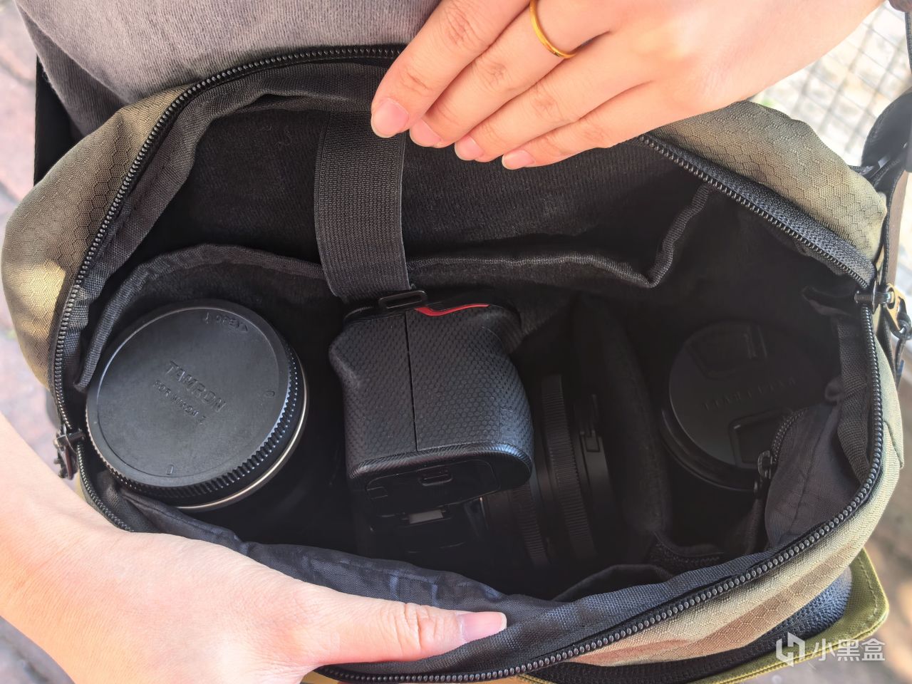 而且主仓的厚度还可以自由调节,调节到最宽处,再加上它随包附赠的三个隔板,就摇身一变成了一个能携带一机三镜的专业摄影包。像我这次旅游,包里就装着一个腾龙的18300跟永诺的56F1.8,丝毫不显累赘,还有空余地方可以放充电宝跟手机等。实用性直接拉满。