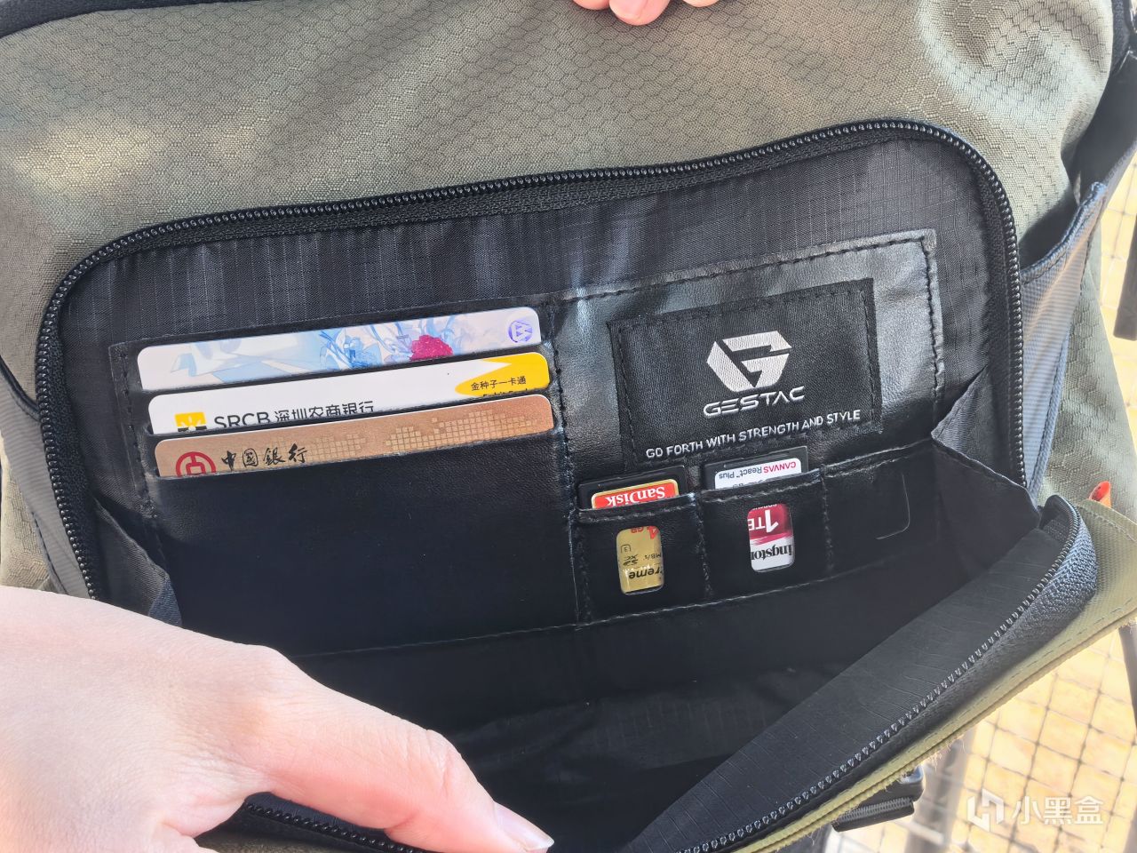 这个斜挎包一共有三个仓,前面是一个扁平的小仓,且设有三个卡片收纳槽跟三个SD储存卡槽。实用性很强。