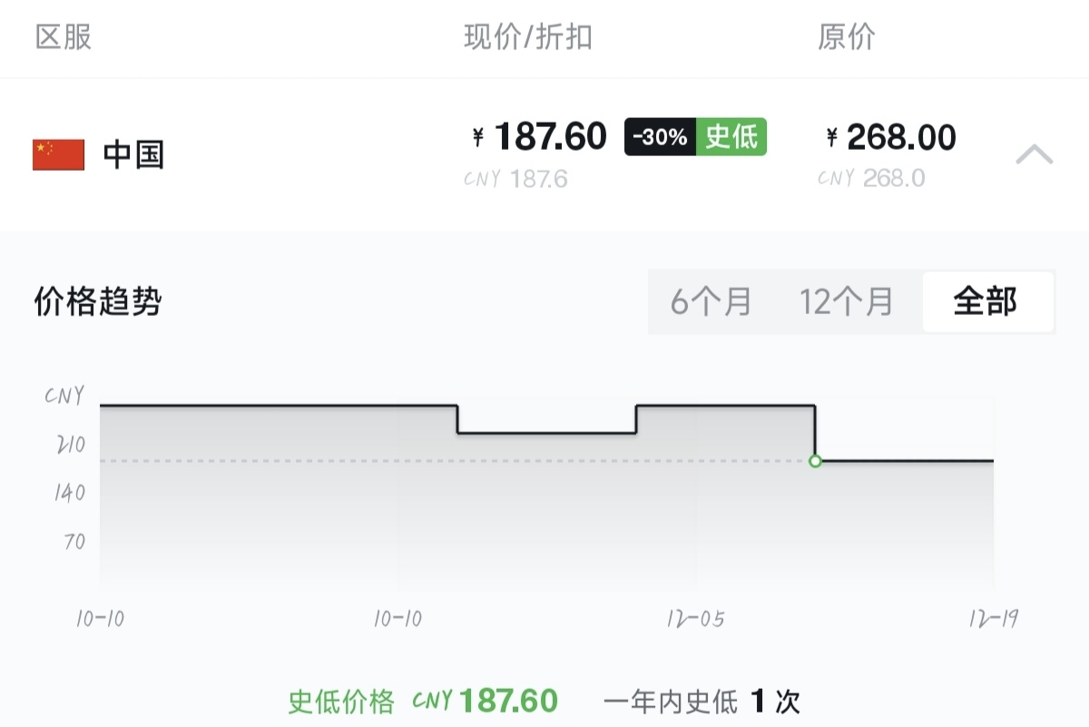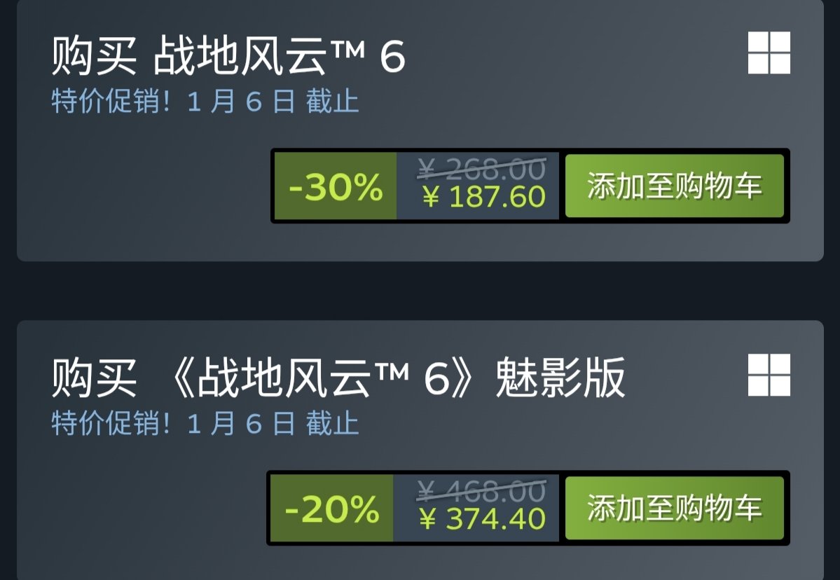 战地风云6在继上一次新史低以后,又迎来了新的史低,现在仅需187.6,战地六抱回家。