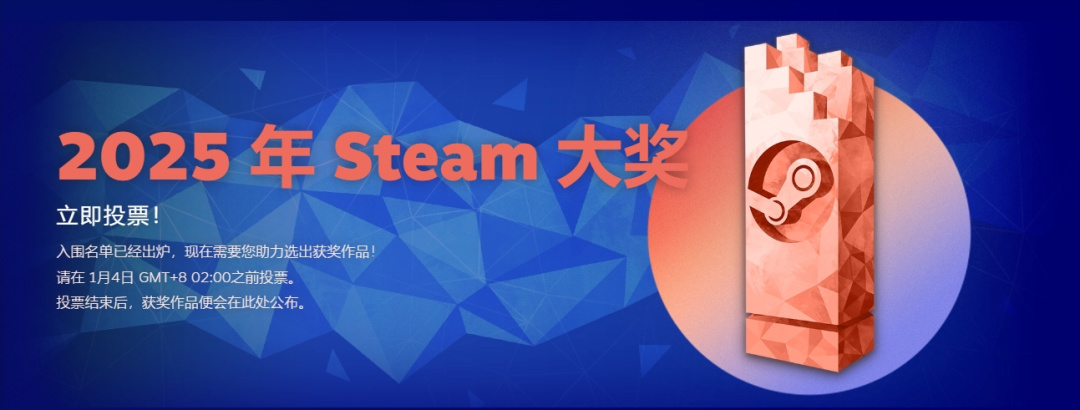 2025年Steam大奖11个奖项提名名单已经出炉,所有非受限 Steam 账户皆可参与 Steam 大奖投票。您可以为十一个奖项中的每个奖项投一票,每个奖项只能获得一张贴纸。最终获奖名单将于北京时间 2026 年 1 月 4 日2:00公布。