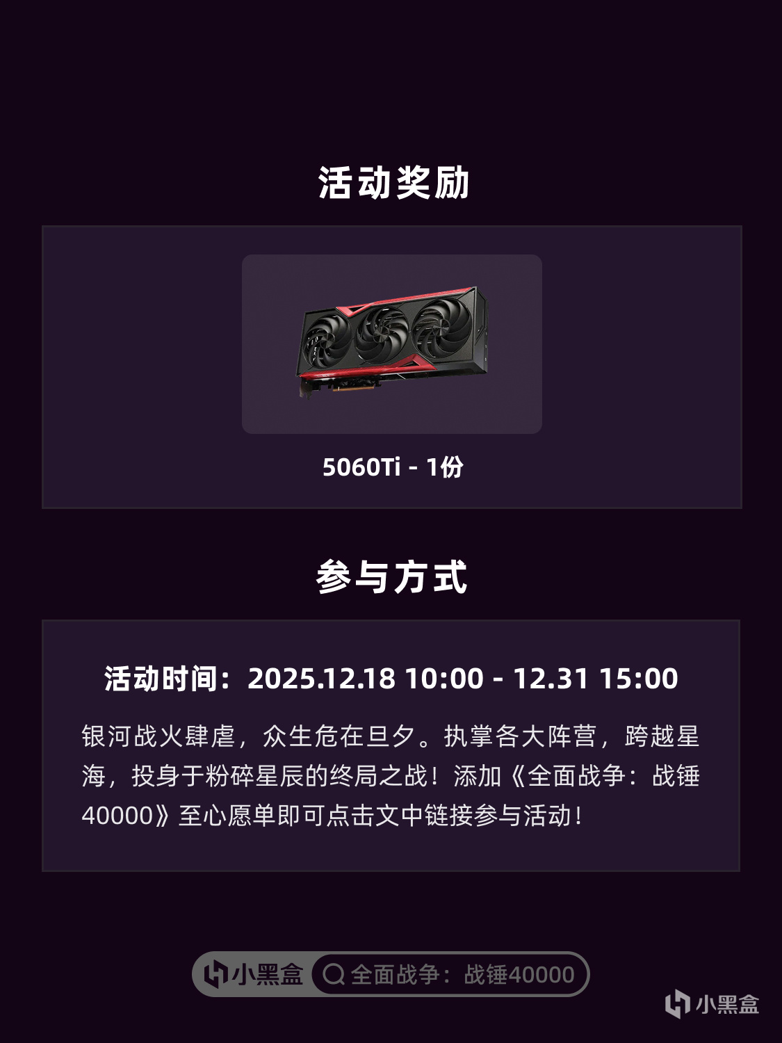 添加《全面戰爭:戰錘40000》至心願單即可點擊https://api.xiaoheihe.cn/store/roll_room_v2?award_id=5423參與活動贏取5060Ti顯卡!