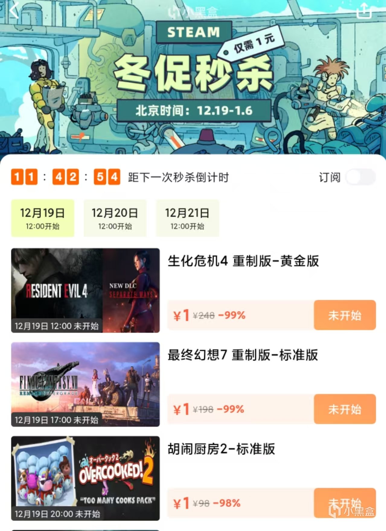 黑盒冬促1元秒殺將於19正式開啓,活動時間19—21,分三個時間段送!3A秒殺有最終幻想,生化危機,消逝的光芒,浪人崛起等