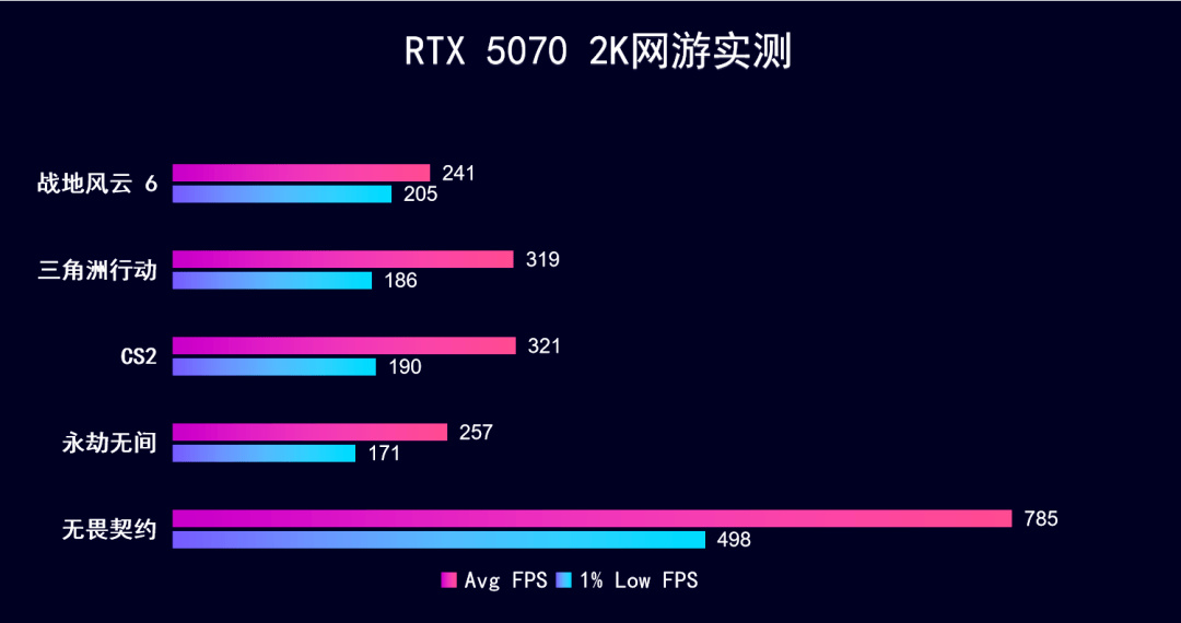 接下來是幾款熱門網遊測試,實測《戰地風雲 6》、《三角洲行動》、《CS2》、《永劫無間》、《無畏契約》可在2K分辨率下進行FPS 240+的遊戲,4K分辨率下FPS 144+,降低一些畫質設置可進一步提高遊戲FPS幀數