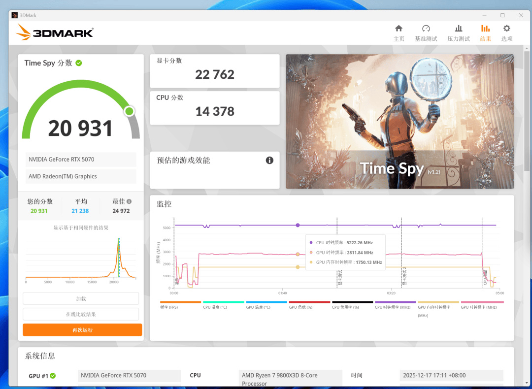 3DMark實測,Time Spy 分數22762,顯卡GPU核心頻率高達2.8G左右