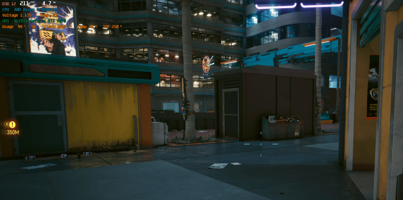 我們先看《賽博朋克2077》的遊戲監控,測試顯卡99%佔用率達到高負載狀態,顯卡250W功耗, GPU核心79度,GPU核心頻率2800MHz左右,遊戲時沒有出現GPU降頻 遊戲幀數不穩定現象。