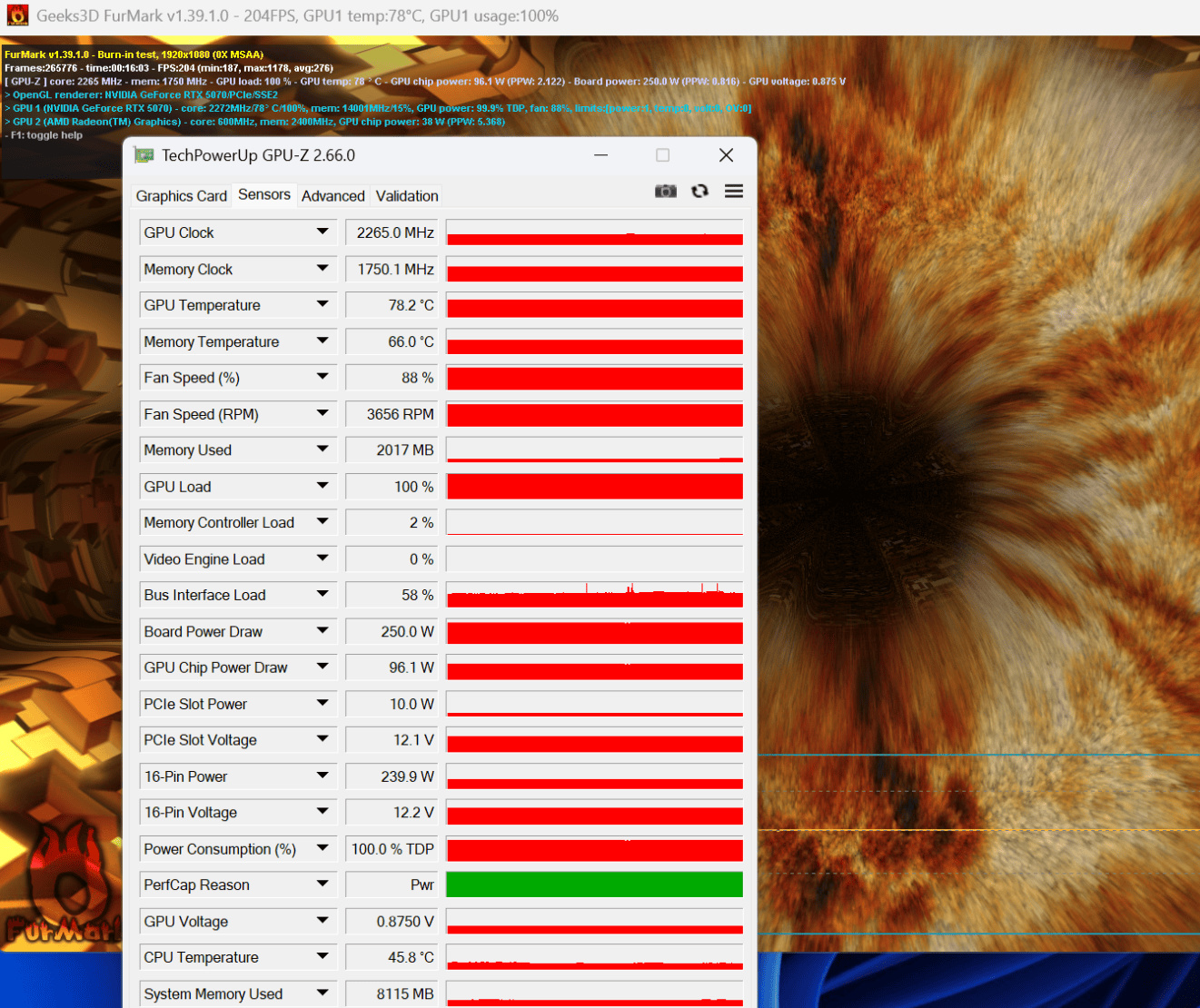 接下來是Furmark烤機測試,烤機時顯卡功耗穩定在250W ,GPU核心78.2度 核心頻率2265MHz 左右 顯存66度。