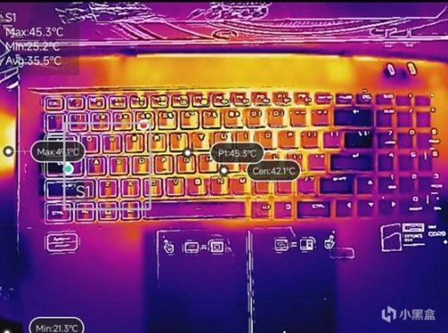 实测双考满载时用户位噪声大概是53分贝,这是该机的体验优点之一——要比不少游戏本的风扇噪声都低。C面温度方面,热度堆积在键盘中部区域,此区域有微热感,约45℃,操控区域和腕托凉快。