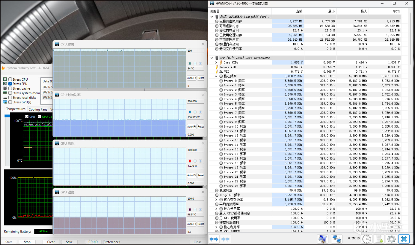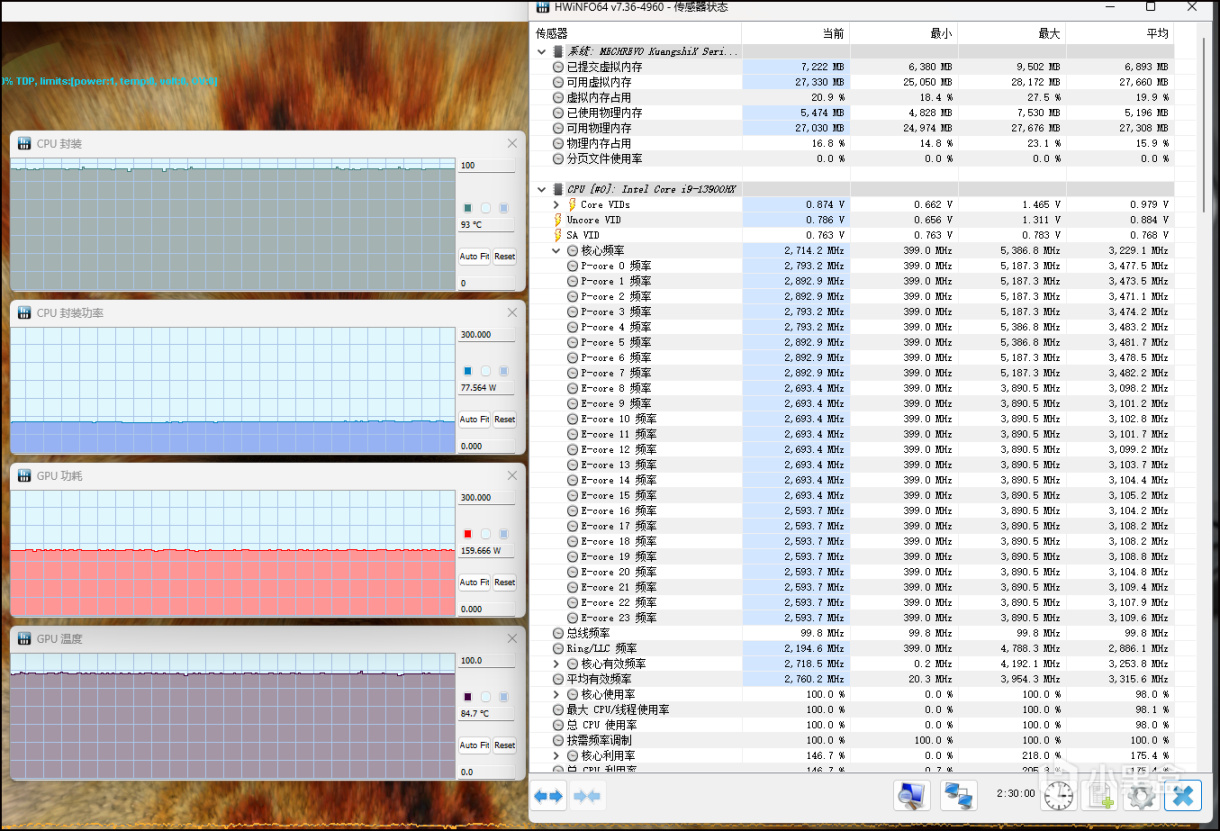 室温22℃左右,对机械革命旷世X进行双考测试(风冷),半小时之后的情况如下所示:i9 13900HX处理器的封装功耗约为77W,温度约93℃;RTX 4080 Laptop GPU的功耗在大概是160W,温度约84.7℃,整机满载的性能释放达到了237W,性能释放强悍。