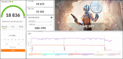 从3DMark的基准测试结果来看,机械革命旷世X搭载的175W款RTX 4080 Laptop GPU堪称性能狂飙,在大家最熟悉的Time Spy测试项目中,该机的显卡得分达到了19673,相比上一代满功耗的RTX 3080提升幅度达到了60%以上!表现十分抢眼。在4K分辨率的Time Spy Extreme中,RTX 4080 Laptop GPU相比RTX 3080 Laptop GPU提升了约55%,同样非常出色!