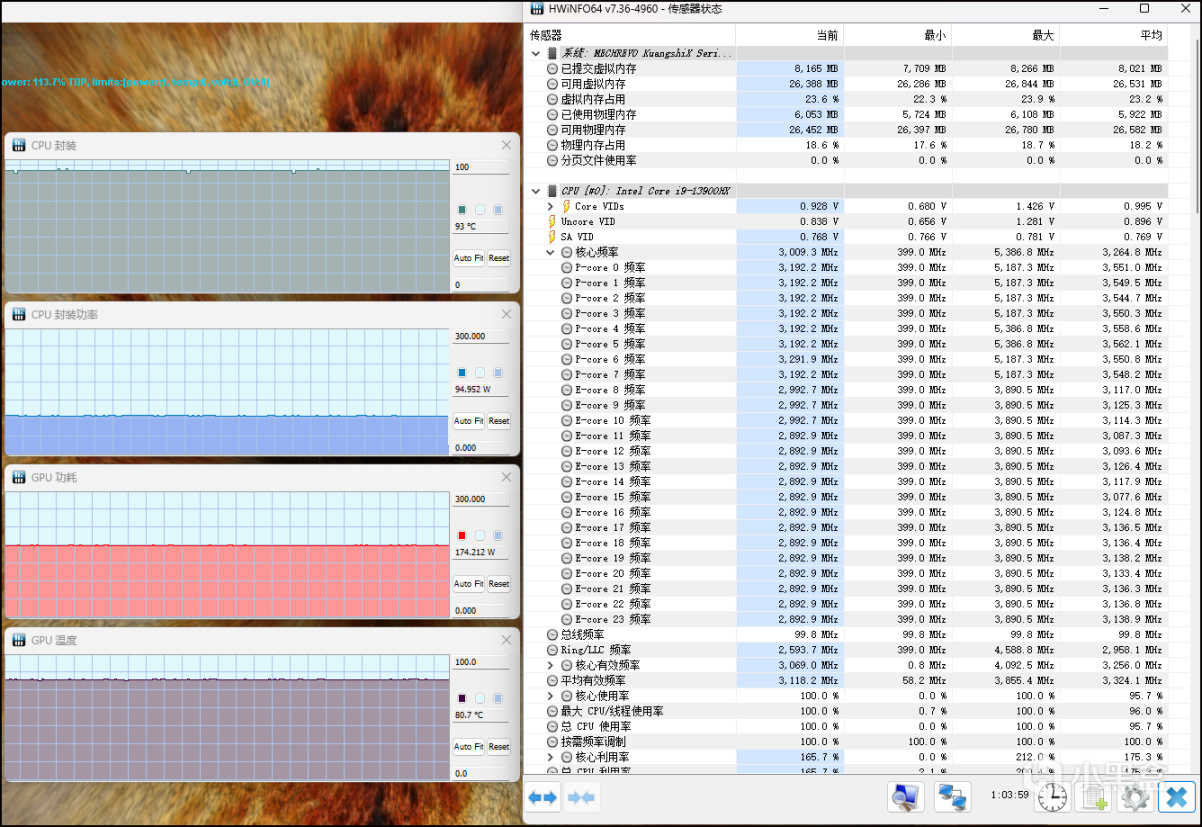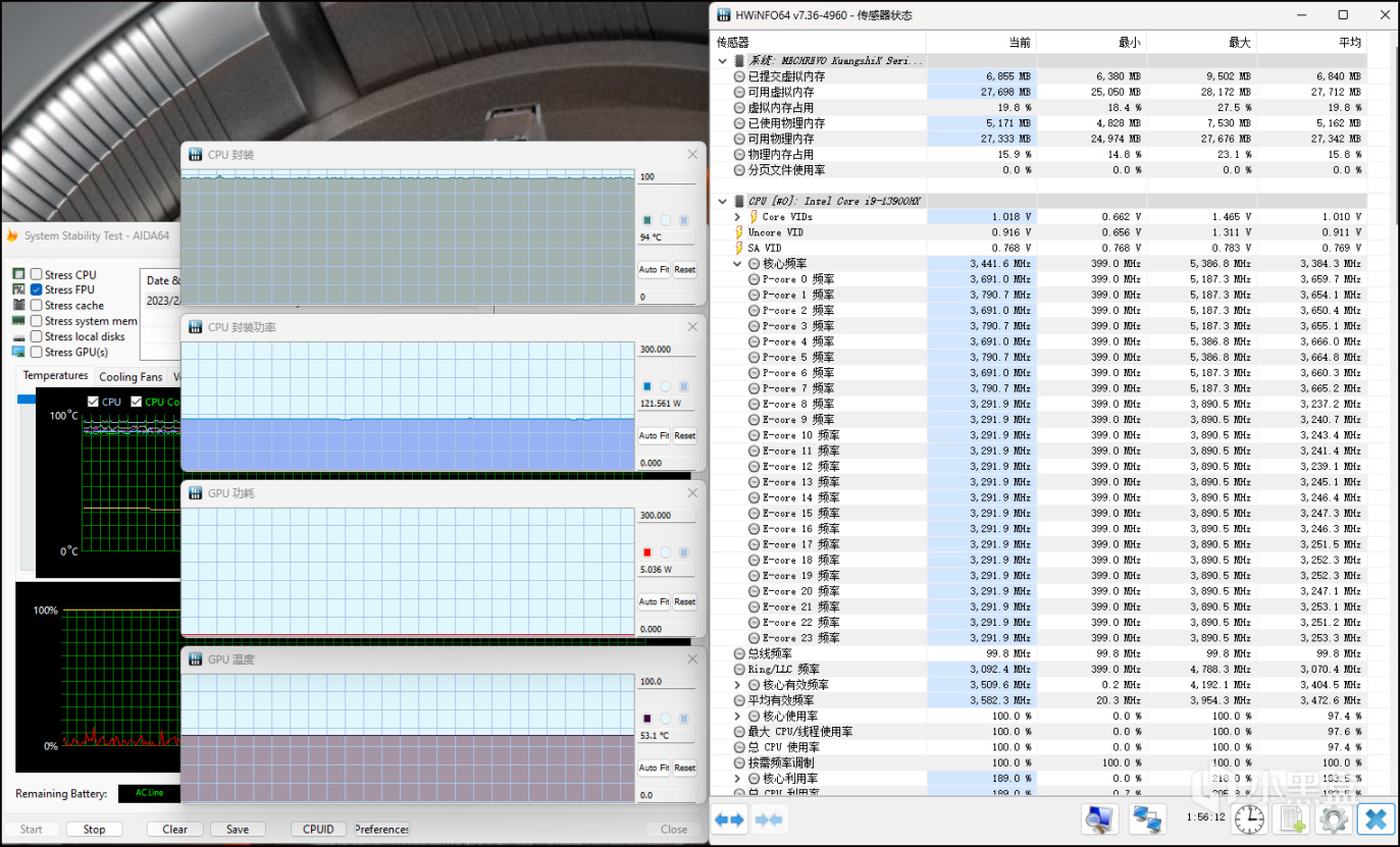▲狂暴模式(风冷),对该机进行单考处理器(FPU)测试,在爆发阶段,i9 13900HX能跑到150W左右,持续半小时考机以后,i9 13900HX稳定在120W附近,温度约为95℃。