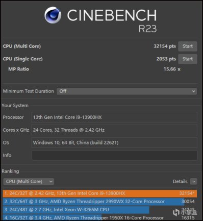 ▲Cinebench R23测试,i9 13900HX得分为多核32154pts,单核2053pts,相当炸裂。一般8核16线程处理器多核在13000pts左右,上一代最强的i9 12950HX(考机130W)多核为23170pts,i9 13900HX强了约38%。